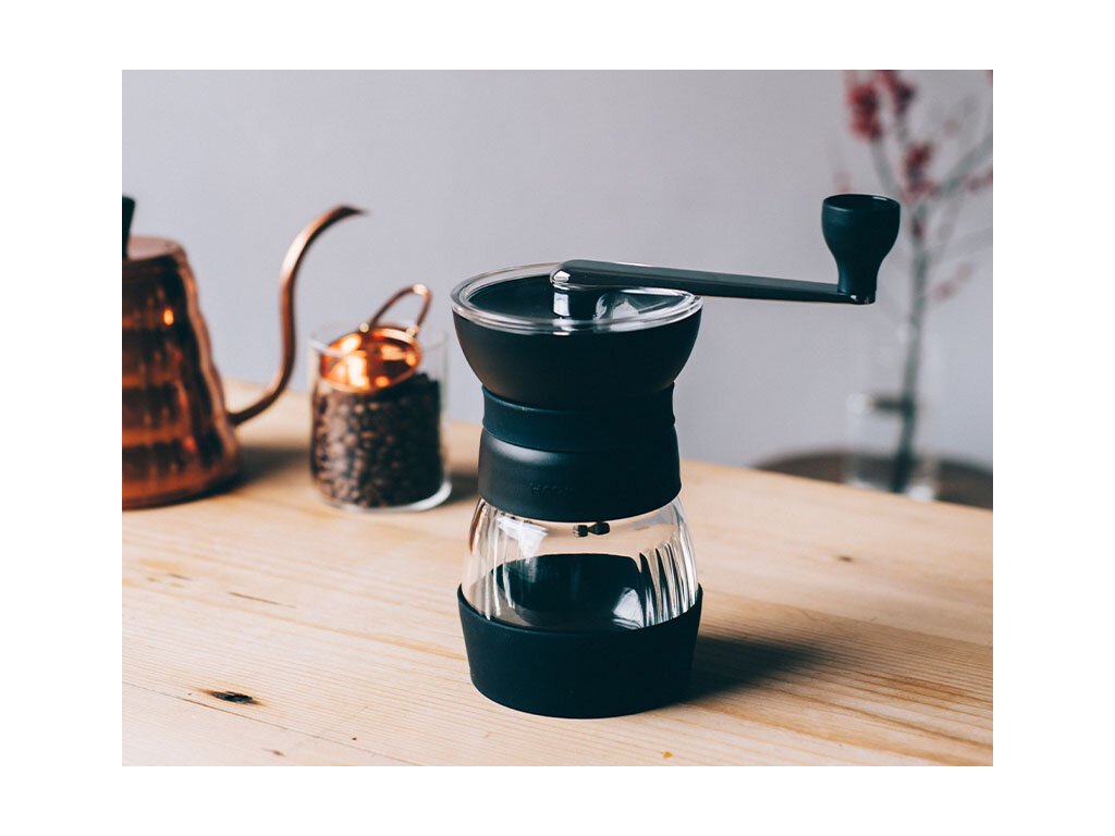 Mlynček na kávu Hario Skerton Pro je vybavený kónickými keramickými mlecími kameňmi a spodná nádoba je sklenená, s protišmykovým gumovým návlekom a vekom na utesnenie čerstvo namletej kávy.