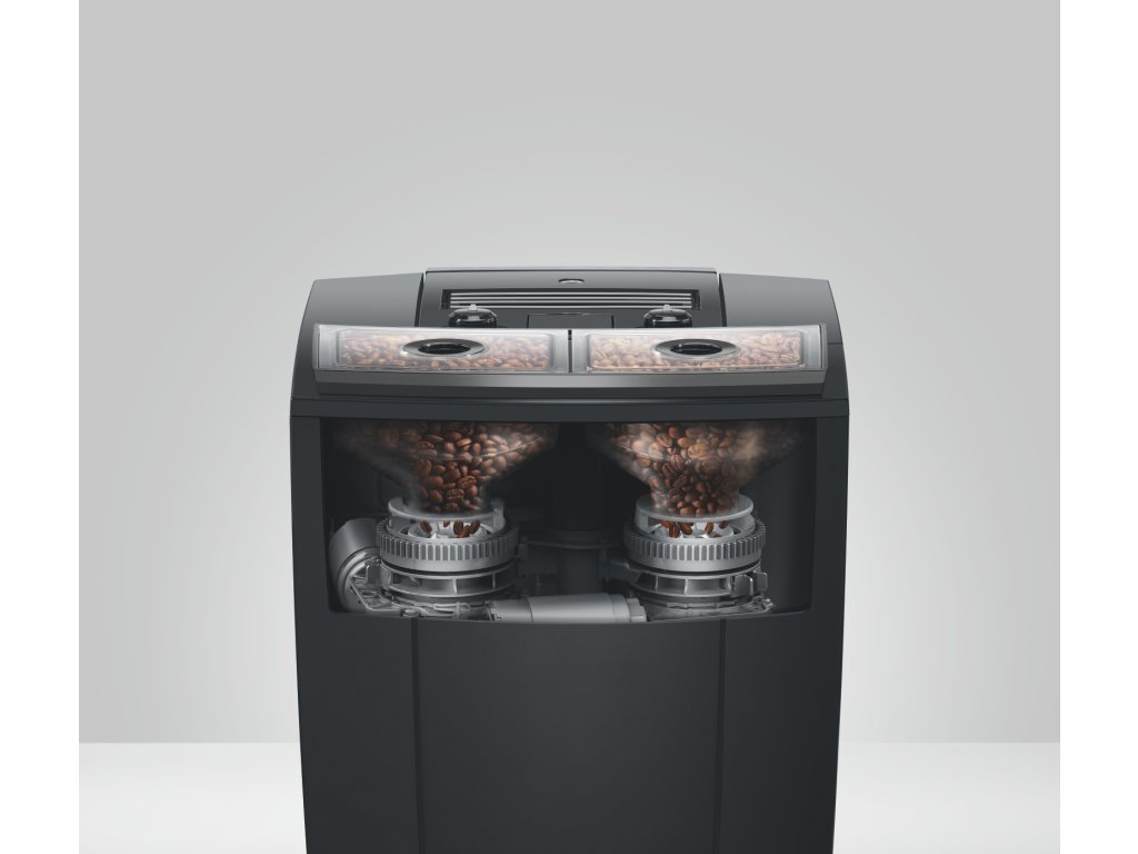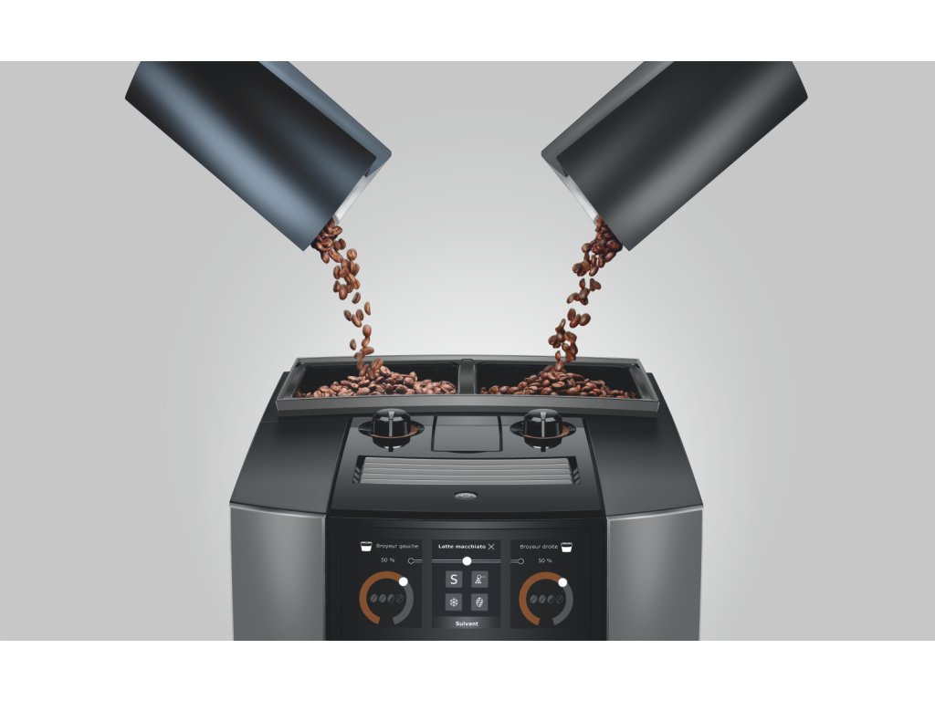 JURA J10 twin Diamond Onyx (EA) je prémiový domáci plnoautomatický kávovar pre tých, ktorí chcú maximálnu slobodu bez kompromisov. Vďaka dvom samostatným mlynčekom P.A.G.3+ a dvom zásobníkom na zrnkovú kávu môžete mať naraz pripravené dva rôzne druhy kávy – napríklad klasickú a bezkofeínovú, alebo svetlé a tmavé praženie – a kávovar automaticky pripraví zvolený nápoj z tej správnej kávy.