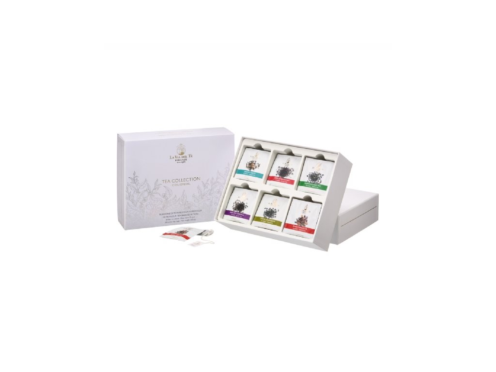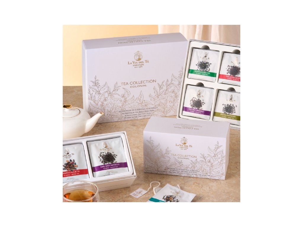 Darčeková krabička pre milovníkov čaju, ozdobená strieborným kvetinovým vzorom, ktorý pripomína rastlinu Camellia Sinensis. Bancha Fiorito, zelený čaj s jazmínom; English Breakfast, klasická zmes čiernych čajov; Marrakech Mint Tea, čínsky zelený čaj s mätou; Earl Grey Imperiale, čierny čaj s vôňou bergamotu; Special Gunpowder, čínsky zelený čaj; Romeo e Giulietta, zelený čaj s príchuťou kúskov jahôd a papáje.